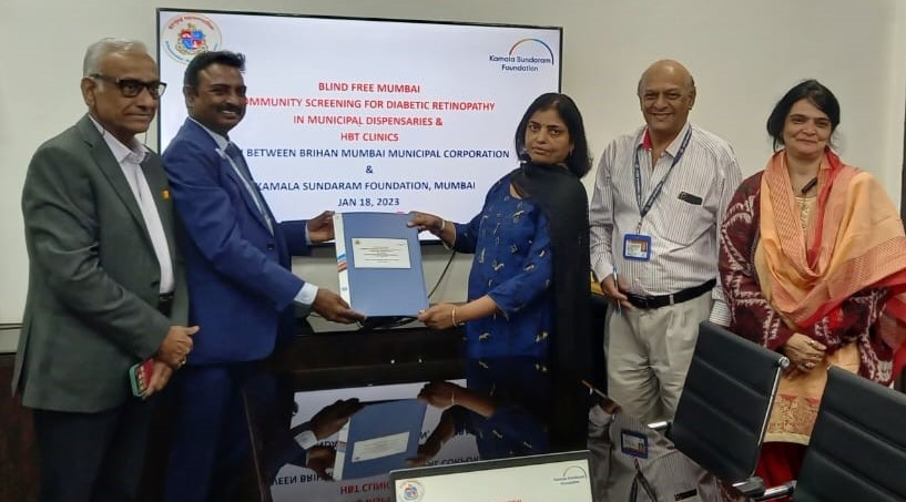 The KSF has been approved as the official partner to provide focussed eye care in all BMC dispensaries and Hindu Hriday Samrat Balashaeb Thackeray (HBT) free clinics. The KSF will screen all the diabetic patients coming to these clinics and check their retina with the help of a special mobile based app with AI. This will give instant findings and the patient will be advised in time for further course of treatment. The formal MOU was signed on January 18, 2023 between the BMC and KSF. Sri Ramakant Biradar, DMC and Dr prof. S. Natarajan, founder trustee of KSF signed and received their copy at the BMC F south office. Dr Mangala Gomare, Executive Health Officer, sri. Vaidyanathan, co trustee, KSF, Dr Pramod Ashtekar Dy EHO, Dr Gulnar Khan MO were present on the occasion.